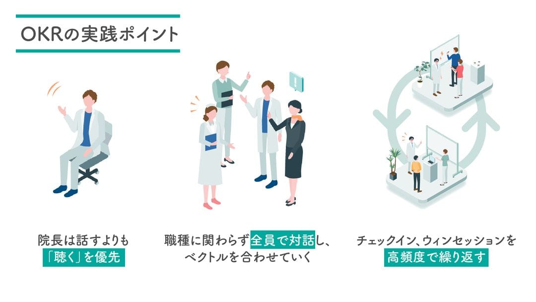 導入する際はいきなりOKRを立てるのではなく、日々の医院について、良い点、悪い点を全員で対話することから始めましょう。現状を全員で共有するだけでなく、振り返り文化を根付かせるためにも大切です。また、歯科医師、歯科衛生士、受付など立場を超えて意見を出し合い過度のトップダウンから脱却できますので、全員のベクトルが合わせやすくなります。