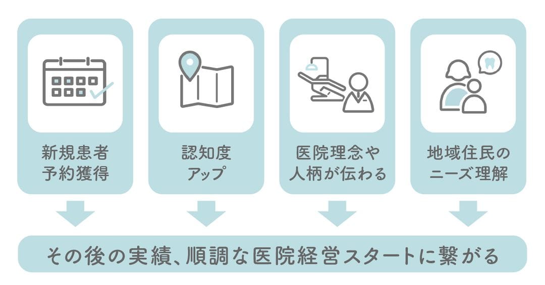 多くの医院様に共通する大きな目的は「予約の獲得」です。治療終了までにかかる回数やメンテナンス等も考えると、その後の予約数にも影響しますし、家族紹介も期待できます。開業直後は患者さんが集まるか、予約が埋まるか、さらには融資元への返済が順調にいくか、色々と心配なことが多いと思います。内覧会である程度の新患予約を取得することで、この不安を解消し、順調なスタートをきることができます。