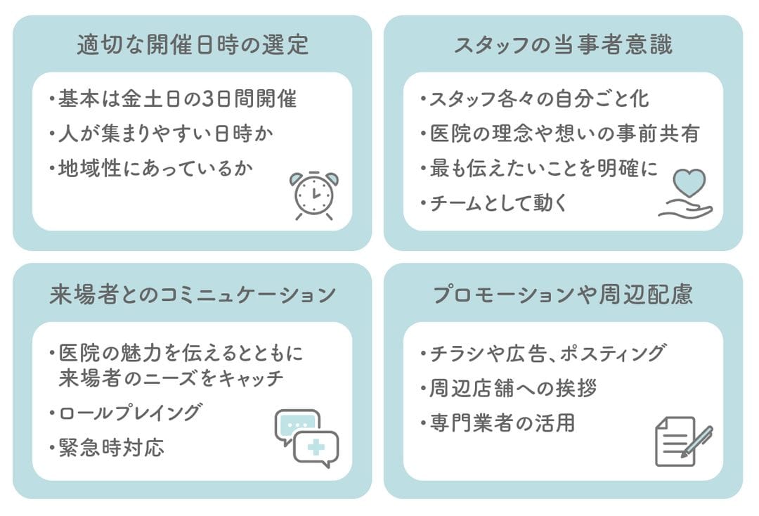 来場者が気軽に立ち寄りやすい日時が良いので、診療開始直前の金土日10:00-17:00頃に開催することが多いです。長期休暇の場合は、帰省や旅行で人がいないこともあるので注意が必要です。地域によって人出のある曜日や時間帯に違いがあるので、医院周辺の人の流れを事前に把握しておくと良いでしょう。