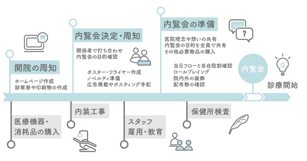 段取り八分と言うように、入念な準備を行って開催日を迎えれば、当日は各々が自信を持って来場者との会話や医院の魅力を伝えることに注力することができ、内覧会の成功に繋がります。