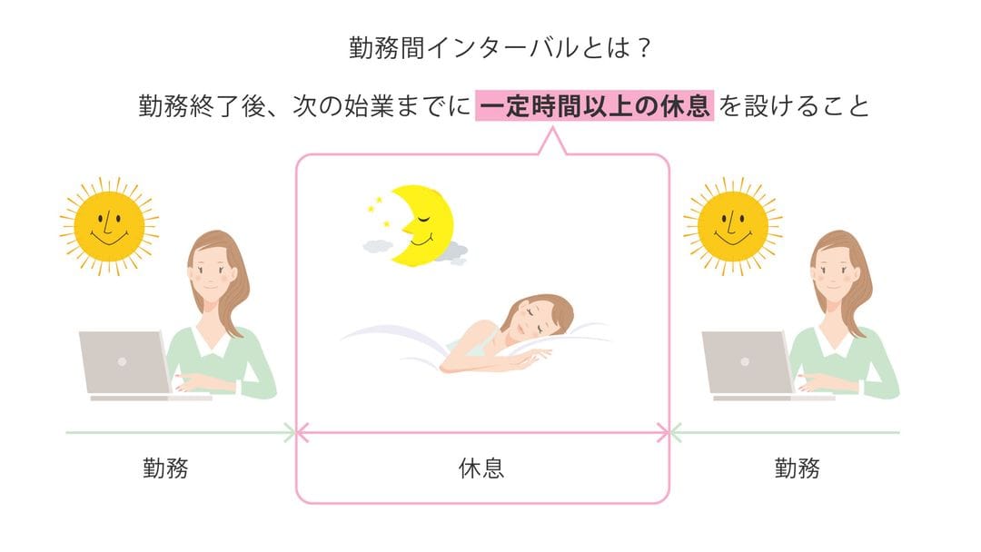 なお、本助成金で定義する勤務間インターバルとは、休息時間数を問わず、就業規則等において終業から次の日の始業までの休息時間を確保することを定めているものです。